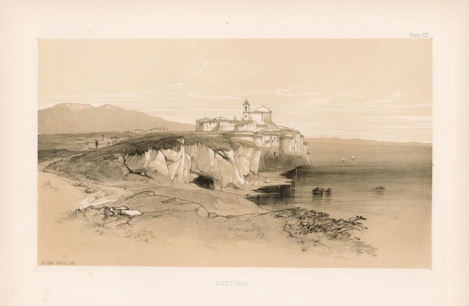 Veduta, antica ed originale, della cittadina di Nettuno stampata su fondino seppia. Inserita nel secondo volume dell’opera “Illustrated excursions in Italy by Edward Lear” London: Thomas M’Lean, 26, Haymarket M.DCCC.XLVI.