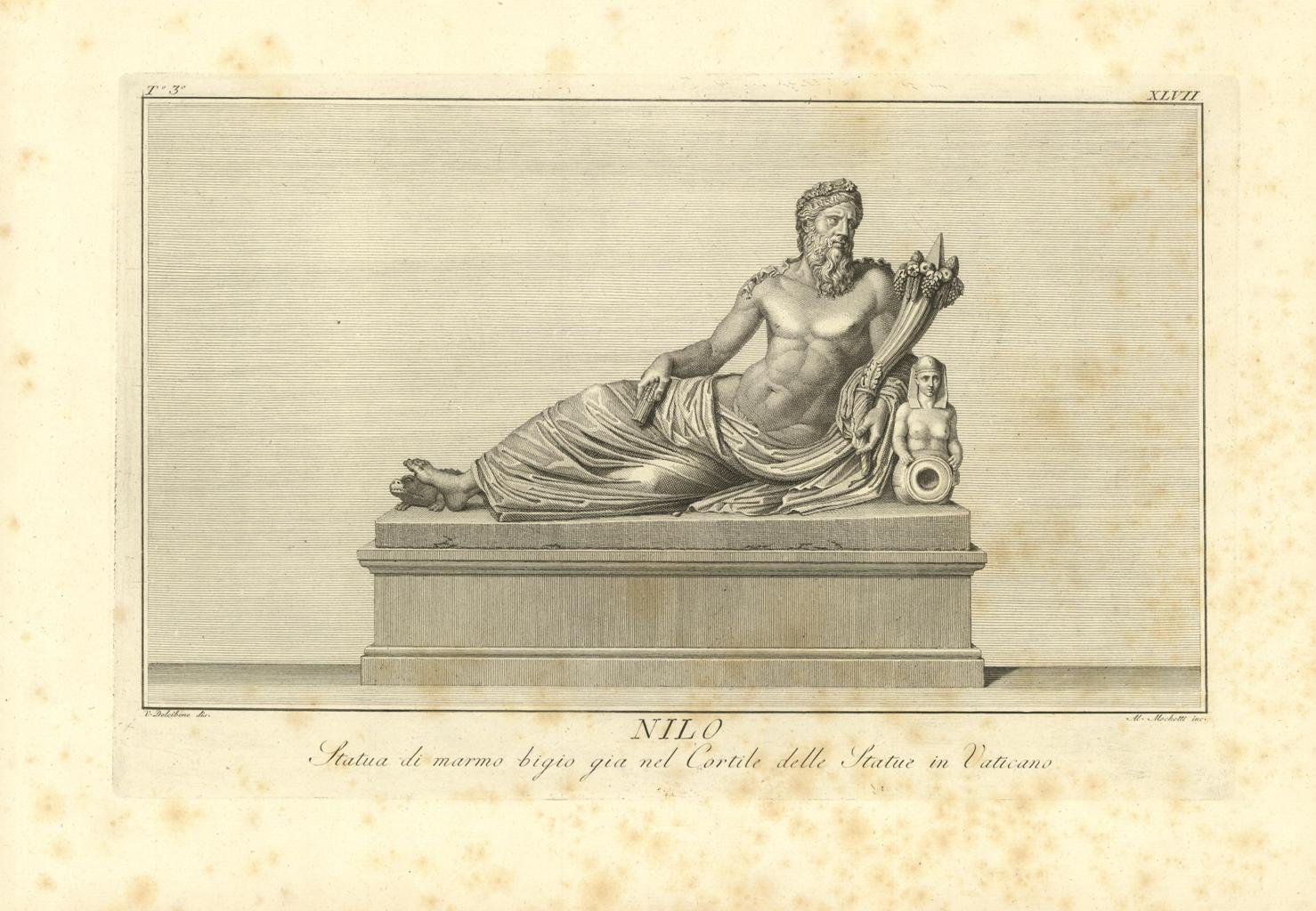 Questa bellissima statua, con sfondo inciso, rappresenta Nilo, dio dello stesso fiume, figlio di Oceano. La grandiosa figura distesa sfoggia un’elegante acconciatura, e sostiene una cornucopia simbolo di abbondanza, fertilità propria delle terre irrigate da questo fiume. Ai piedi della scultura posa un coccodrillo, simbolo del fiume Nilo. Inserita nell'opera "Il Museo Pio-Clementino descritto da Ennio Quirino Visconti - Tomo terzo - Dedicato alla Santità di Nostro Signore PIO SESTO Pontefice Massimo. Edito da Luigi Mirri / Mercante di quadri incontro il Palazzo Bernini. In Roma MDCCLXXXIV con Privilegio Pontificio. Foxing