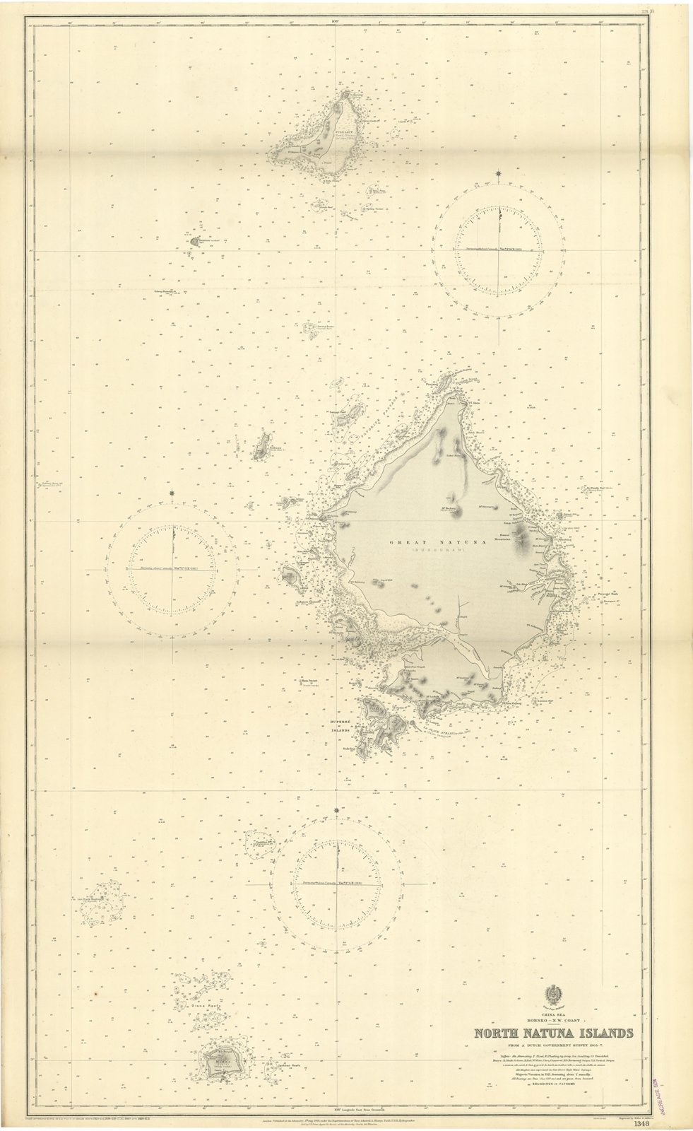 North Natuna Islands from a Dutch Government Survey 1905-7. London Published at the Admiralty 5th Aug. 1909, under the Superintendence of Rear Admiral A. Mostyn Field, Hydrographer. Small corrections: 1929. Editorially folded