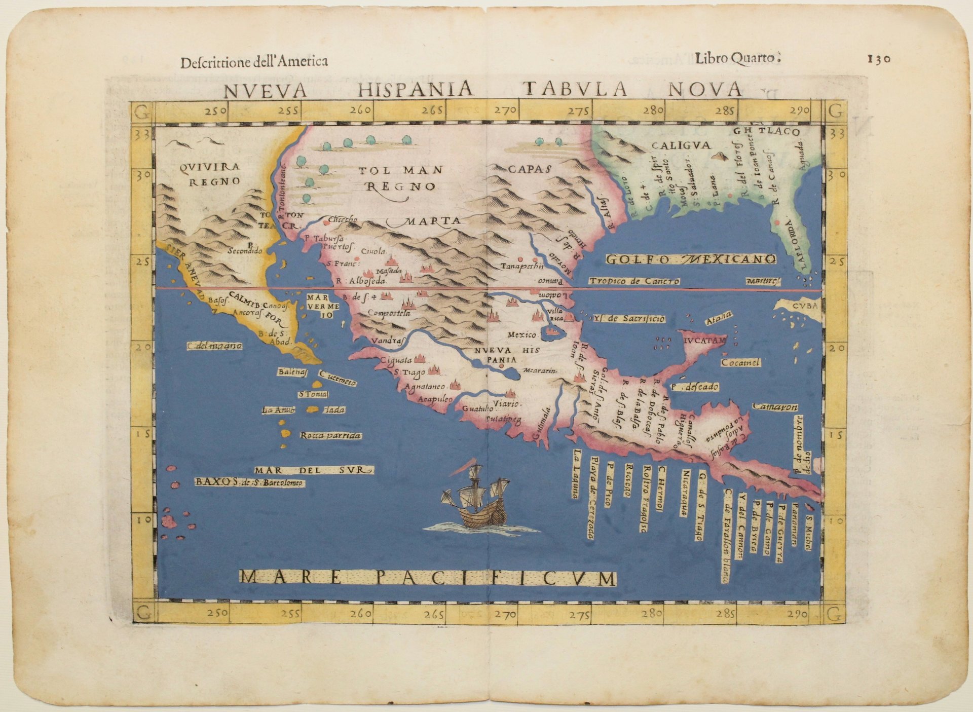 Incisione in rame, dipinta a mano, mm 187x255. Buon esemplare. Tratta dall’edizione della “Geografia” di Tolomeo, curata da Moleto e pubblicata dagli eredi Sessa, terza edizione nella traduzione di Ruscelli. La carta è basata su quella di Gastaldi del 1548 pubblicata nella sua edizione della “Geografia” che fu una delle due prime carte regionali del nord America (insieme a Tierra Nueva Tabula). Questa terza edizione, 3° Stato, risulta la più rara fra i tre stati, è significativamente rielaborata e include numerosi abbellimenti e aggiunte di toponimi e una topografia rivisitata, fra cui molte isole nuove. Come elemento decorativo una nave nel Mare Pacificum. Vengono aggiunte nuove etichette, tra cui Calmifor (California), Sierra Nevad (Sierra Nevada) e Golfo Mexicano (Golfo del Messico). Questa è forse la mappa più influente del Sud-Ovest durante il XVI secolo. È anche una delle prime mappe della regione e rappresenta un importante contributo alla conoscenza della geografia della Nuova Spagna. Bell’esemplare, minimo strappetto di un centimetro al margine destro. Girolamo Ruscelli (1500-1566) nasce a Viterbo ed è un importante scrittore ed editore, che dopo aver studiato a Padova trascorse la propria carriera fra Roma e Napoli, dove morì. Burden 31.