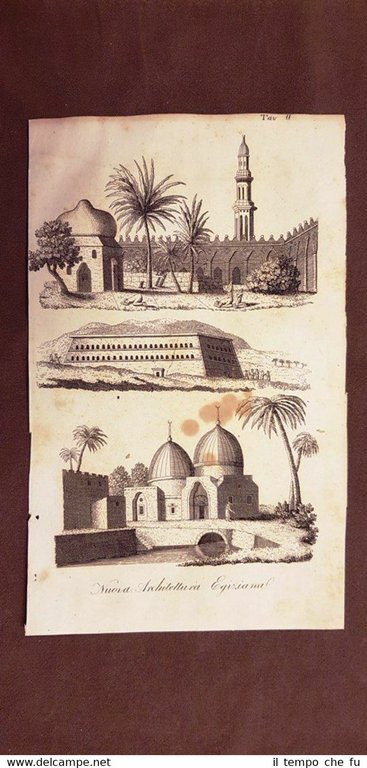 Acquaforte del 1830 Nuova architettura egiziana Egitto Moda e costume Codice articolo: II1878-065 Dimensioni: Cm 21,00 x 13,00 Tavola estratta dalla rarissima opera edita nel 1830 "Il costume antico e moderno, o storia del governo, della milizia, della religione, delle arti, scienze ed usanze di tutti i popoli antichi e moderni provata coi monumenti dell'antichità e rappresentata cogli analoghi disegni", di Giulio Ferrario. Giulio Ferrario (1767-1847), milanese, fu bibliotecario della Biblioteca Braidense, erudito ed autore di fortunate opere di taglio storico-letterario. La monumentale documentazione degli usi e costumi del mondo, fu compilata dal Ferrario con l'ausilio di numerosi collaboratori fu largamente apprezzata in tutta Europa nonche' piu' volte ristampata e tradotta anche fuori dai confini italiani. Un'autentica miniera di informazioni storiche, geografiche, etnologiche ed antropologiche, anche relative a parti del mondo al tempo ancora scarsamente indagate. Paypal Carta di credito Bonifico bancario Spedizione con posta ordinaria o raccomandata scelta dall'Acquirente nel momento del pagamento Clicca qui per accedere al nostro Store ed al suo sterminato archivio
