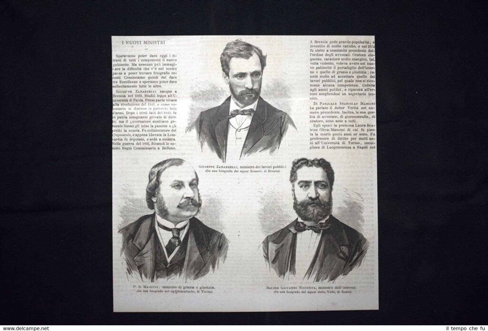 Rara incisione estratta da pubblicazione del 1876. .incisione che ha quindi oltre 141 anni! I nuovi ministri Giuseppe Zanardelli, ministro dei lavori pubblici P. S. Mancini, ministro di grazia e giustizia Barone Giovanni Nicotera, ministro dell'interno Dimensioni Cm 23,00 x 24,00 EP1876 - 103 Qualora vogliate delle scansioni migliori contattateci, soddisferemo ogni vostra richiesta. Paypal Carta di credito Bonifico bancario Accuratamente adagiate su un cartoncino e protette da pellicola trasparente rigida, il tutto viene inserito dentro plico di adeguate dimensioni per proteggerne l'integrità.