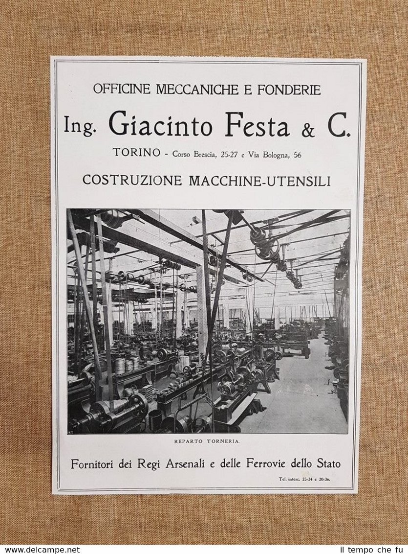 Officine meccaniche fonderie Giacinto Festa Torino Torneria Pubblicità del 1918 Rara stampa estratta da pubblicazione del 1918 Officine meccaniche e fonderie Giacinto Festa & C. Torino Reparto torneria Pubblicità del 1918Dimensioni: Cm 25,00 x 35,00 Codice prodotto: Pubblicità - 110