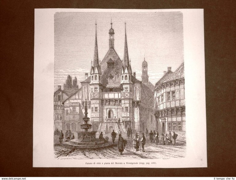 Rara incisione estratta da pubblicazione d'epoca del 1863. .incisione che ha quindi oltre 155 anni! Palazzo di città e Piazza del mercato di Wernigerode nel 1863 Sassonia-Anhalt Germania GDM-006 Dimensioni Cm 21,00 x 19,00 Qualora vogliate delle scansioni migliori contattateci, soddisferemo ogni vostra richiesta. Paypal Carta di credito Bonifico bancario Accuratamente adagiate su un cartoncino e protette da pellicola trasparente rigida, il tutto viene inserito dentro plico di adeguate dimensioni per proteggerne l'integrità.