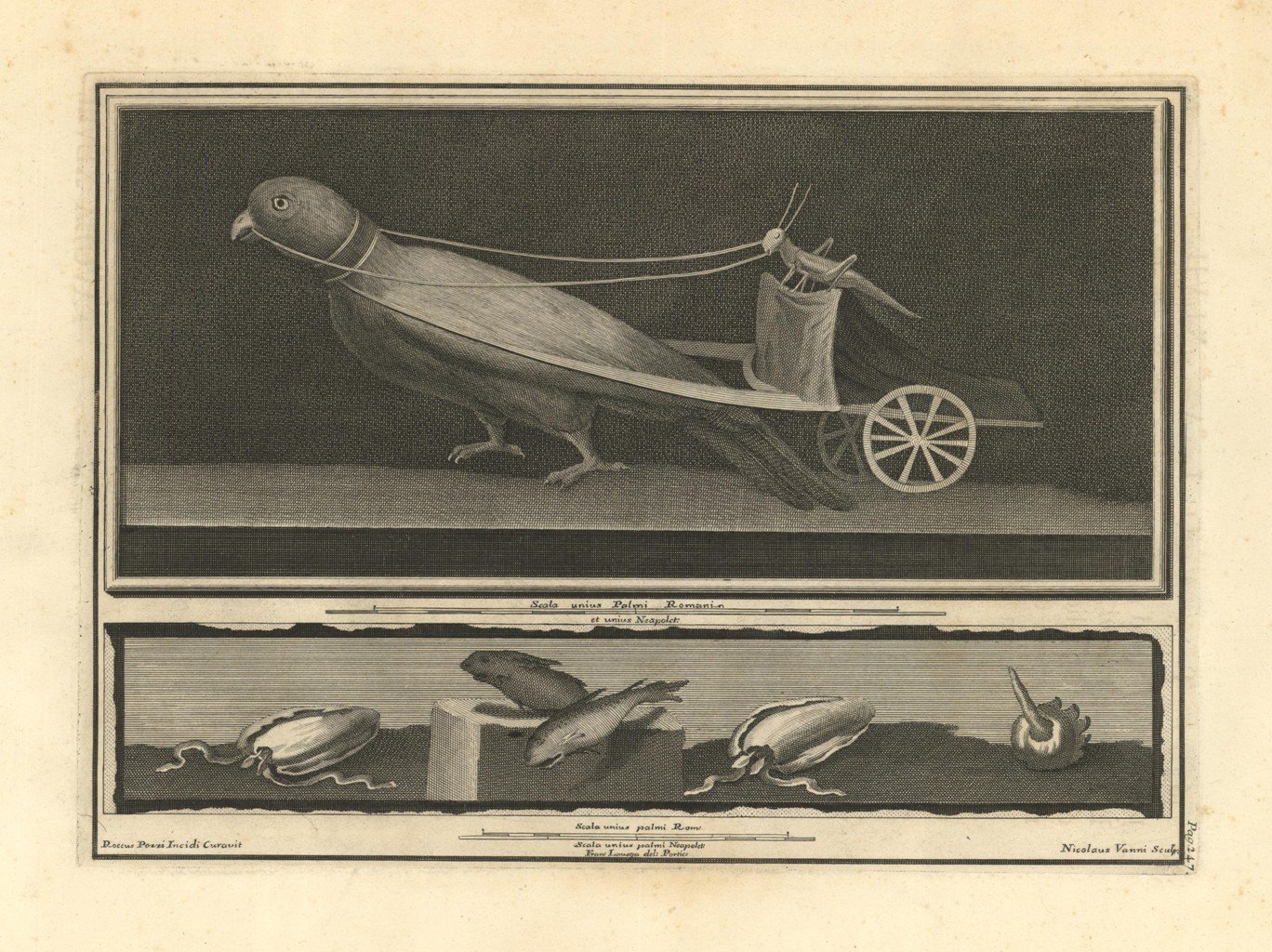 Incisione raffigurante dipinti con scena di pappagallo che tira un carretto e nature morte ritrovate negli scavi. Tratta dal tomo primo della monumentale opera "Le Pitture antiche d'Ercolano e contorni incise con qualche spiegazione", sontuosamente illustrata da diversi artisti tra i quali: Giuseppe Aloja, Nicola Billi, Pietro Campana, Nicola Cesarano, P. Gaultier, Francesco Martano, Filippo Morghen, Camillo Paderni, Rocco Pozzi, N. Ricci, Nicola Vanni, Francisco de Vega. Edita a Napoli dalla Regia Stamperia nel 1757