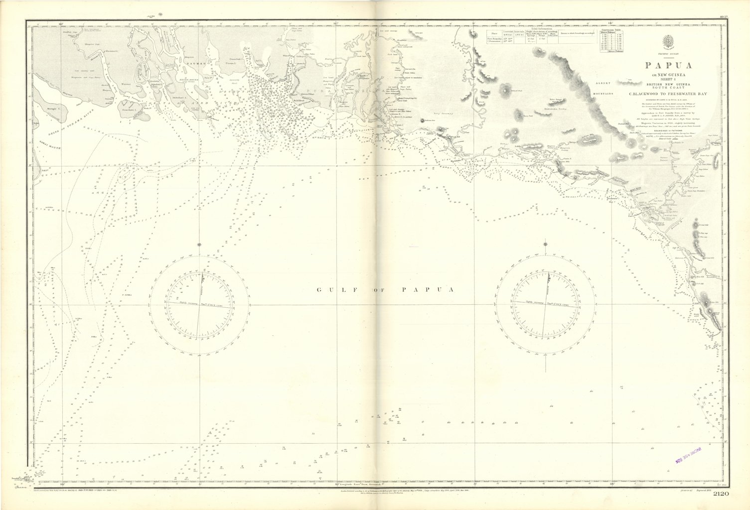Papua or New Guinea - sheet 4 - British New Guinea South Coast C. Blackwood to Freshwater Bay surveyed by Lieut. C.B. Yule, 1846. The Interior and Rivers are from Sketch surveys by Officers of the Government of British New Guinea under the direction of Sir William Macgregor, 1892-3. Approaches to Port Romilly from a survey by Lieut. L.T. Jones, 1914. London Published according to Act of Parliament at the Hydrographic Office of the Admiralty May 24th 1852. Small corrections: 1926. Editorially folded