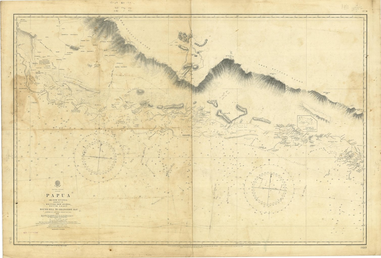 Papua or New Guinea - sheet 6 - British New Guinea South Coast Round Hill to Orangerie Bay surveyed by Capt. Owen Stanley 1850. The Coastline and topography in fine line are from Sketch Surveys by Officers of the Government of British New Guinea under the direction of Sir WilliamMacgregor, 1891. In the right side of the chart a small insert of Nobanoka Bay or Port Glasgow by Mr. Goldic of the ship Explorer 1878. London Published according to Act of Parliament at the Hydrographic Office of the Admiralty May 24th 1852. Small corrections: 1928. Editorially folded. Autore: Admiralty Charts. Luogo: Nuova Guinea. Anno: '900. Dimensioni: 626x953 mm