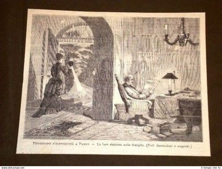 Splendida Incisione Ottocentesca Estratta da Rivista d'Epoca Parigi Esposizione d'Elettricità La Luce elettrica nelle Famiglie IP1881-040T Dimensioni Cm 19,00 x 15,50 Qualora vogliate delle scansioni migliori contattateci, soddisferemo ogni vostra richiesta. Paypal Carta di credito Bonifico bancario Accuratamente adagiate su un cartoncino e protette da pellicola trasparente rigida il tutto viene inserito dentro plico di adeguate dimensioni per proteggerne l'integrità