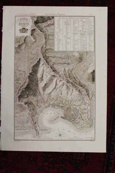 Incisione in rame di mm 338x522 (immagine) incisa da Giacinto Maina su disegno di P. Manzoni e G. Maina. Attilio Zuccagni-Orlandini (1784-1872) fu un cartografo e geografo italiano. La sua opera principale è senza dubbio la Corografia fisica, storica e statistica dell'Italia e delle sue isole, cui l'incisione appartiene. La Corografia si compone di dodici tomi (senza contare i vari supplementi), stampati tra il 1833 e il 1845, ed è corredata da un atlante in due volumi e da numerose mappe geografiche e topografiche, nonché da tavole illustrative. <BR>Bell'esemplare.