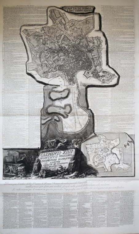 La Pianta di Roma e del Campo Marzio appartiene al culmine della carriera del Piranesi.Nata dalla necessità di offrire una pianta di riferimento che accompagnasse le 135 tavole delle Vedute di Roma, l'opera fu intesa come tavola finale e indice dell'opera, con con cui veniva spesso venduta e rilegata. Attraverso le tre lastre che compongono questa grande piante, l'autore ha cercato di mettere in relazione le rovine superstiti di epoca antica con la contemporanea topografia di Roma, e di offrire dei riferimenti per i monumenti elencati ai due lati della mappa. Nella parte superiore ha realizzato una mappa della città contemporanea compresa entro le Mura Aureliane, estendendola a nord, a includere il territorio tra Porta del Popolo e Ponte Milvio, e inglobando anche l'area del Campo Marzio.Quest'area è mostrata nel dettaglio in una mappa isolata, in basso a destra, che mostra le antichità più importanti evidenziate da un numero che trova corrispondenza con quelli della mappa più grande. Ai lati, un indice dettagliato dei monumenti, con i numeri corrispondenti nella pianta grande, e con i rimandi ai passaggi più rilevanti delle sue opere maggiori: le Antichità Romane, Della Magnificenza ed Archittettura dei Romani e il Campo Marzio. L'opera è dedicata a papa Clemente XIV (1769-1774).La datazione dell'opera è complessa: - nel catalogo del 1792 di Francesco Piranesi, figlio dell'autore, l'opera è assegnata al 1778, data che, sebbene molto tarda - l'autore muore infatti il 9 novembre di quell'anno - viene accettata da Focillon e Hind. Questa datazione, tuttavia, è certamente basata su un errore, poiché nell'Avvertimento nella parte superiore della mappa, l'autore fa riferimento alla "approvazione che si è degnata mostrarne la Santità di N.ro Sig.re PAPA CLEMENTE XIV felicemente regnante", per cui l'opera non può essere successiva al 1774.A supporto di questa datazione, è un esemplare del Catalogo delle Opere, descritto da Scott, che contiene tre voci manoscritte per tre Vedute di Roma databili al 1774, e indica che la mappa era già disponibile.Esemplare dalla contemporanea edizione romana.Acquaforte e bulino, stampata da tre matrici su tre fogli carta vergata coeva uniti insieme, con filigrana "doppio cerchio e giglio", in ottimo stato di conservazione.Dimensione complessiva dei tre fogli: 132.1 x 82.1 cm Dimensioni complessive delle lastre: 121.2 x 71.1 cm Map of Rome and the Campus Martius, formed by three plates and usually found in association with the Vedute di Roma. He may have felt the need for a reference map to accompany collections of these plates and devised this work to fill this need. Exercising his skills in presenting formidable quantities of information coherently, he sought to relate the surviving remains of antiquity to the contemporary topography of Rome and to offer an easy reference to published information about them. He therefore produced a large map of the modern city within the Aurelian Walls, together with an extension showing the territory to the north, between Porta del Popolo and Ponte Milvio and including the Campus Martius area.This is augmented by a smaller map isolating the principal antiquities, which were marked with numbers correspondending to those in the larger map. Around these Piranesi arranged a detailed index listing the monuments according to their assigned numbers and referring to relevant passages in his major pubblications, including the Antichità Romane, Della Magnificenza ed Archittettura dei Romani and Campo Marzio.The dating of the map is problematic, since, although it is dedicated to Clemente XIV (1769-1774), Francesco Piranesi's 1792 cataloghe assigns is to 1778 and most authorities, including Giesecke, Focillon and Hind, have accepted a late, if not posthumous date; however this date is certainly based on error, since Giambattista, in his Avvertimento at the top of the main map, refers to "l'approvazione che si è degnata mostrarne la Santità di N.ro Sig.re PAPA CLEMENTE XIV felicemente regnante". Supporting evidence for an earlier date comes from an impression of the Catalogo delle Opere, referred to by Scott, which contains manuscript entries for the three Vedute di Roma datable to 1774 and indicates that the map was already available. Etching, printed from the plates on three sheets of contemporary laid paper with watermark, double circle with the fleurs-de-lys.A very good early impression for the contemporary roman edition. Cfr. Hind, p. 87, [1778-9.]; Focillon 600; Ficacci 700; Wilton-Ely, II, 1008.