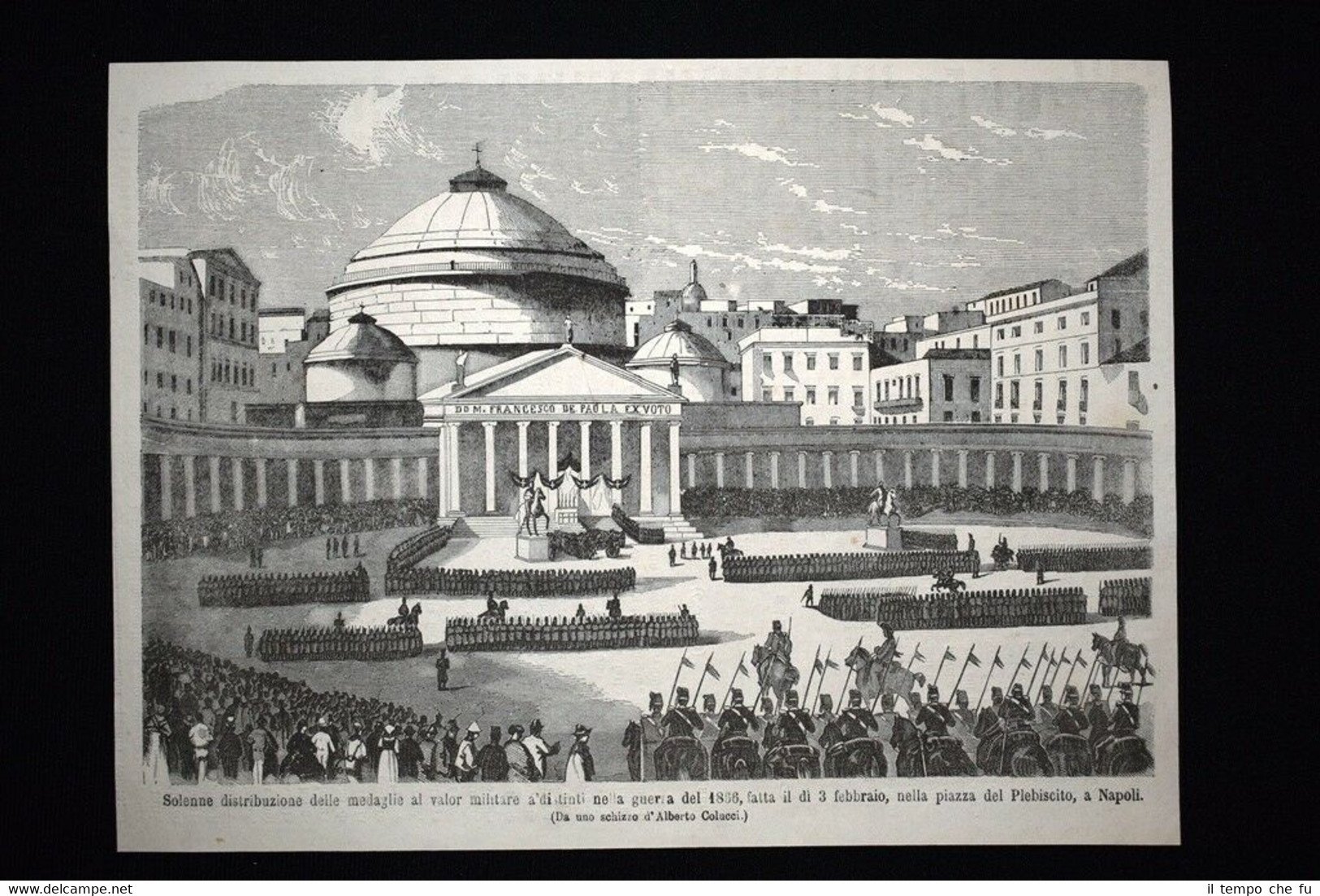 Rara incisione estratta da pubblicazione del 1867. .incisione che ha quindi oltre 150 anni! Solenne distribuzione delle medaglie al valor militare ai distinti nella guerra del 1866, fatta il di 3 febbraio, nella piazza del Plebiscito a Napoli Da uno schizzo di Alberto Colucci Dimensioni Cm 26,00 x 19,00 EP1867 - 002 Qualora vogliate delle scansioni migliori contattateci, soddisferemo ogni vostra richiesta. Paypal Carta di credito Bonifico bancario Accuratamente adagiate su un cartoncino e protette da pellicola trasparente rigida, il tutto viene inserito dentro plico di adeguate dimensioni per proteggerne l'integrità.
