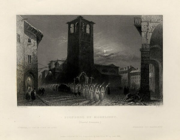 PINEROLO - "Pignerol by moonlight (Funeral procession)" Scena notturna con funerale nel centro cittadino.