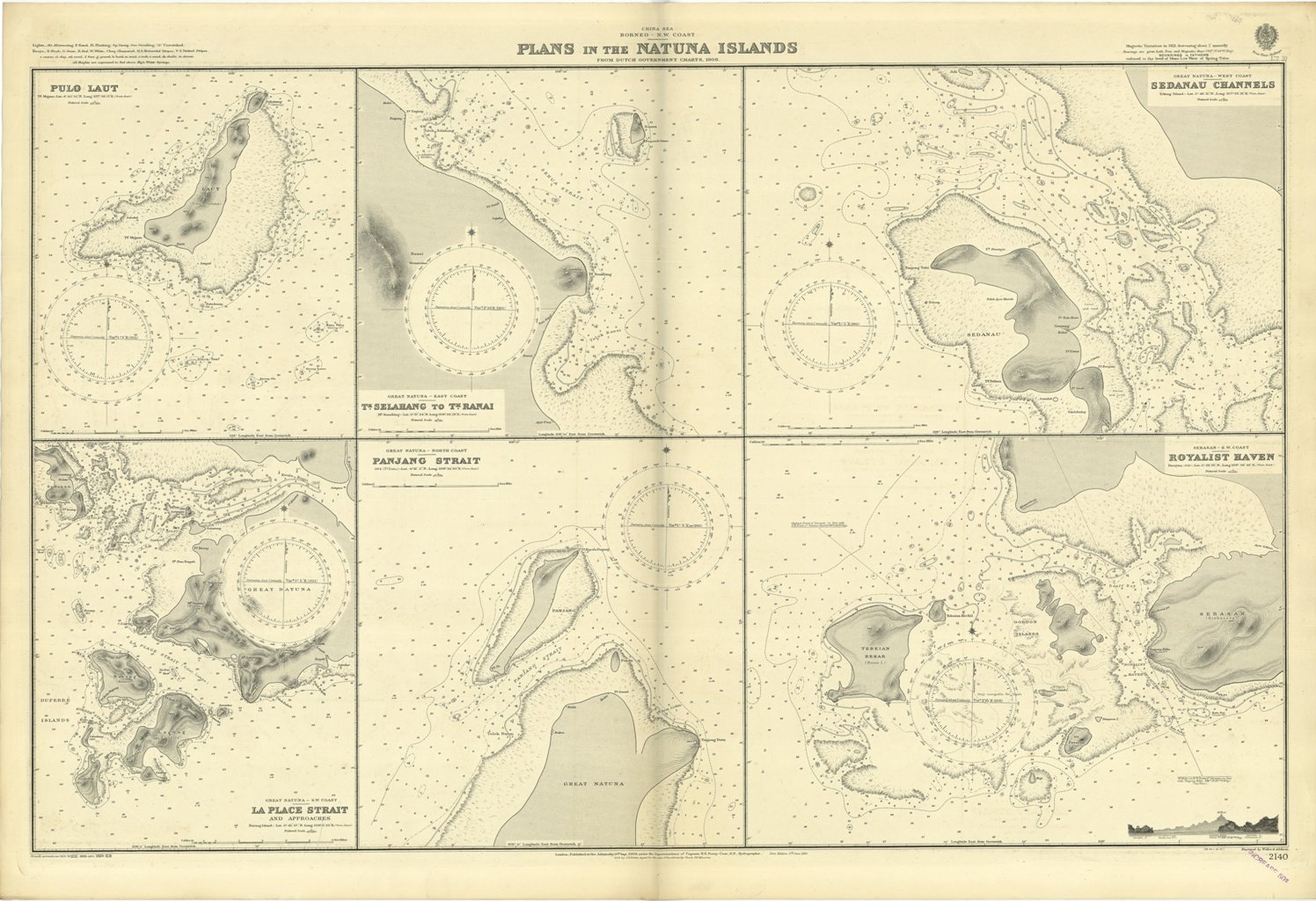 Plans in the Natuna Islands from Dutch Government Charts, 1908.Magnetic Variation in 1921, decreasing about I annually.In the left side of the chart insert of Pulo Laut and La Place Strait and approaches. In the middle insert of T.k Selahang to T.k Ranai and Panjang Strait. In the right side insert of Sedanau Channels and Royalist Haven.London Published at the Admiralty, 10th Sept. 1909, under the Superintendence of Captain H.E. Purey-Cust, Hydrographer. Small corrections: 1929. Editorially folded