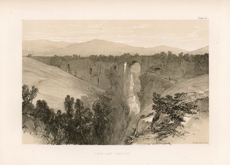 Veduta, antica ed originale, della cittadina di Ponte Sant'Antonio stampata su fondino seppia. Inserita nel secondo volume dell’opera “Illustrated excursions in Italy by Edward Lear” London: Thomas M’Lean, 26, Haymarket M.DCCC.XLVI.