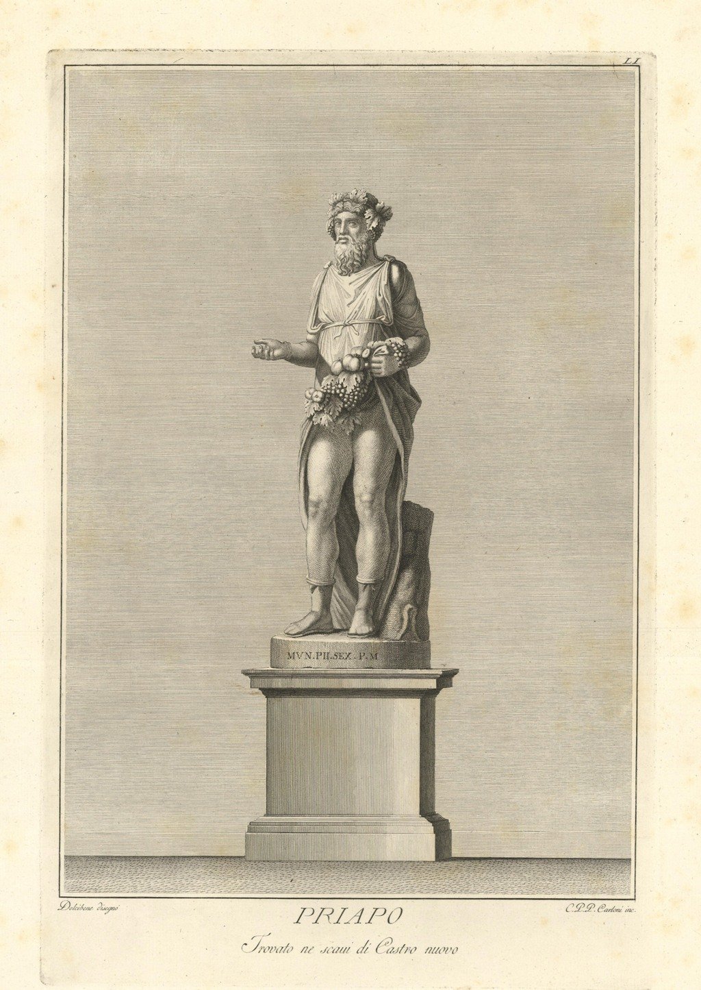 La statua, con sfondo inciso, raffigura Priapo un personaggio della mitologia greca e romana, figlio di Dioniso e di Afrodite. Il suo aspetto era grottesco; fu dotato, per mano di Era, di enormi genitali qui coperti dai simboli propri di Bacco, rappresentando la forza maschile e la fertilità. Inserita nell'opera "Il Museo Pio-Clementino descritto da Giambattista Visconti Prefetto delle antichita di Roma - Tomo primo - Dedicato alla Santita di Nostro Signore PIO SESTO Pontefice Massimo. Edita da Ludovico Mirri / Mercante di quadri incontro il Palazzo Bernini. In Roma MDCCLXXXII con privilegio Pontificio
