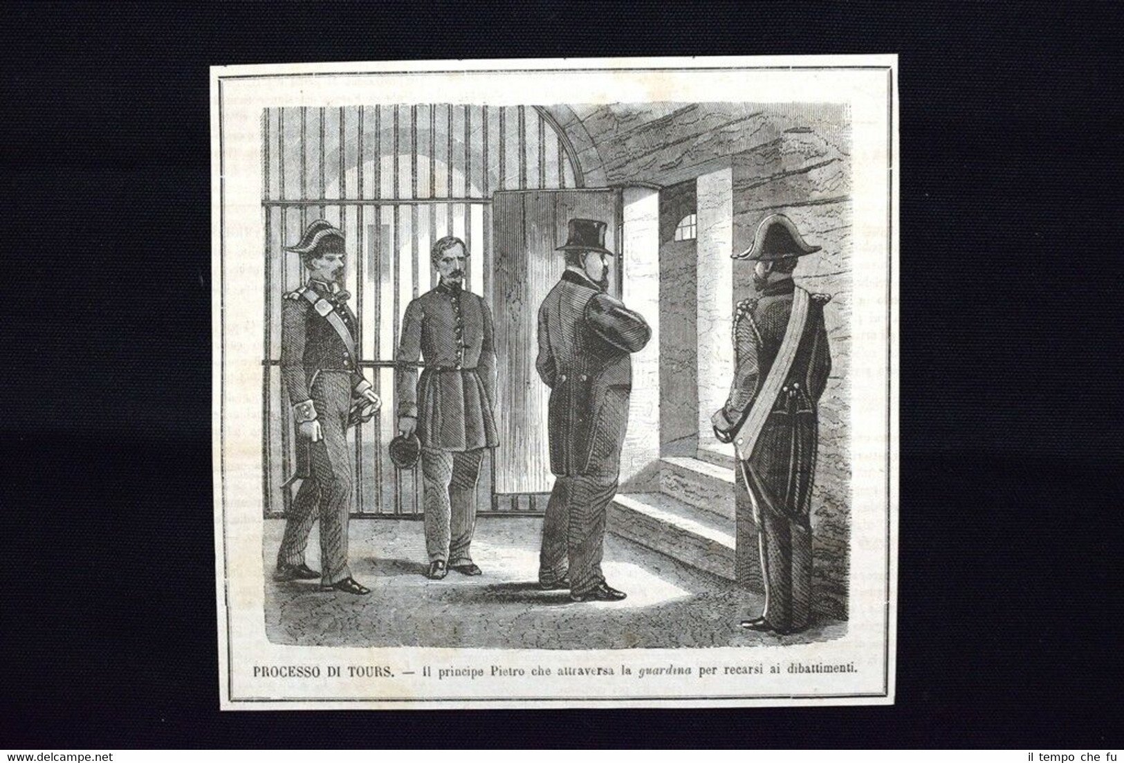 Rara incisione estratta da pubblicazione del 1870. .incisione che ha quindi oltre 147 anni! Processo di Tours Il principe Pietro Bonaparte che attraversa la guardina per recarsi ai dibattimenti Dimensioni Cm 16,00 x 15,00 EP1870 - 002 Qualora vogliate delle scansioni migliori contattateci, soddisferemo ogni vostra richiesta. Paypal Carta di credito Bonifico bancario Accuratamente adagiate su un cartoncino e protette da pellicola trasparente rigida, il tutto viene inserito dentro plico di adeguate dimensioni per proteggerne l'integrità.