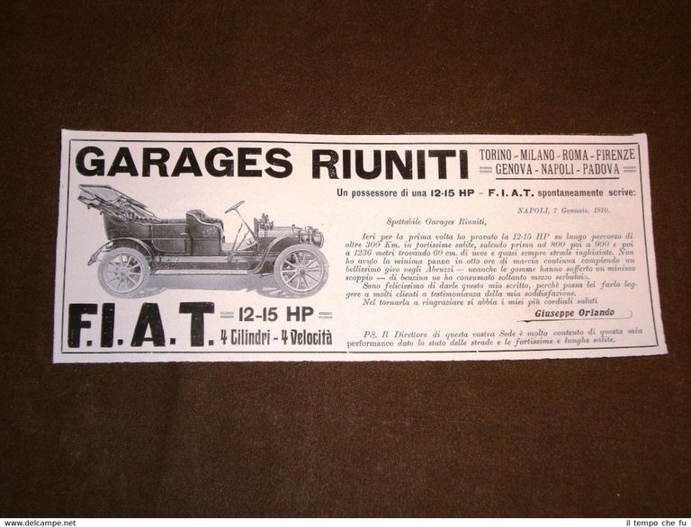 Pubblicità del 1910 Garages Riuniti Auto o automobile FIAT 12 - 15 HP