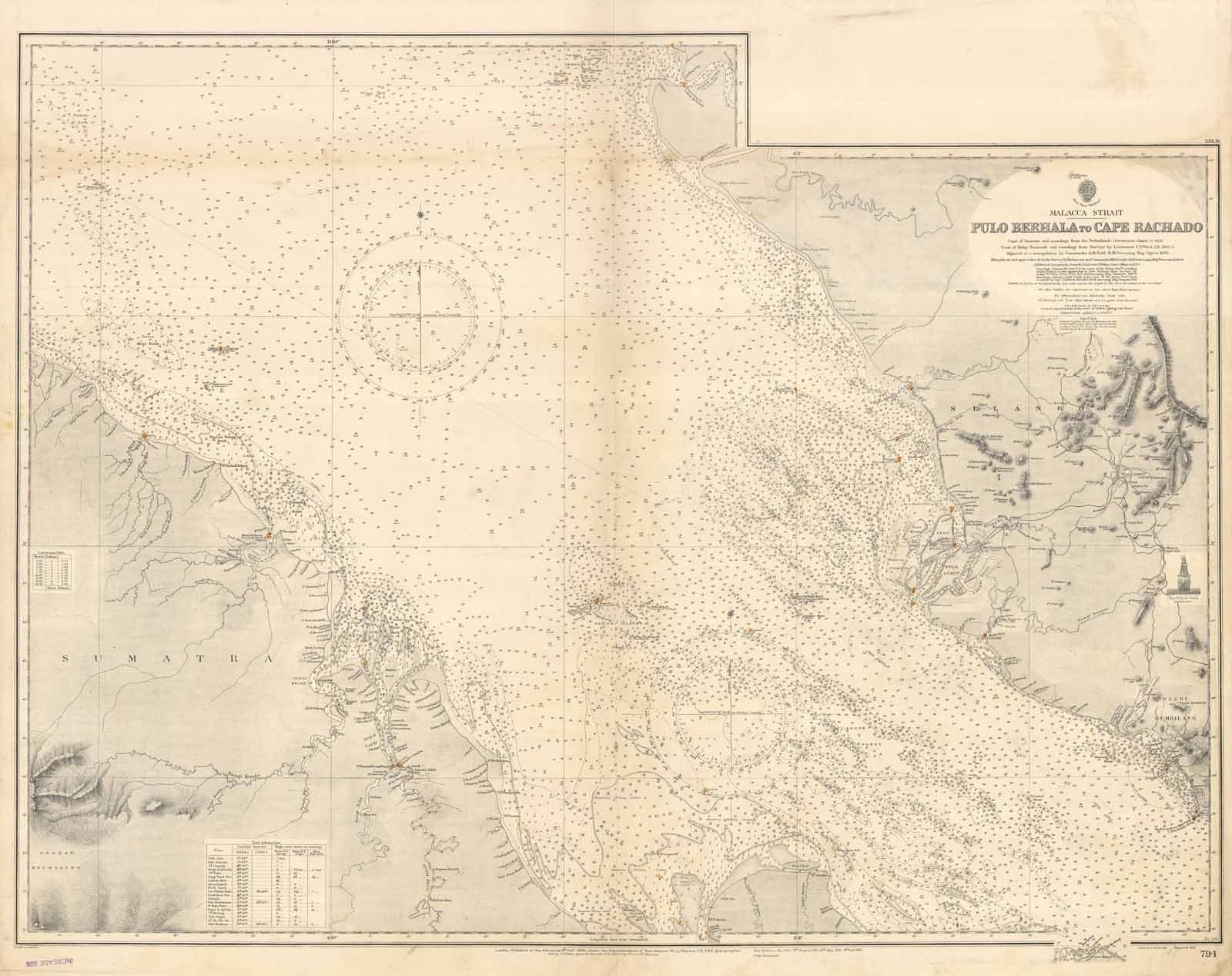 Coast of Sumatra and soundings from the Netherlands Government Chart to 1928. Coast of Malay Peninsula and soundings from Surveys by Lieutenant C.Y. Ward 1852-5. Adjusted to a triangulation by Commander A. M. Field H. M. Surveying Ship "Egeria" 1893. Klang Strait and approaches from the Survey by Lieutenant and Commander H. P. Douglas H. M. Surveying Ship "Waterwitch" 1908. London Published at the Admiralty 8 Oct.r. 1895 under the superintendence of Rear Admiral W. J. L. Wharton Hydrographer. Large corrections: 4 Sept. 1931. Editorially folded