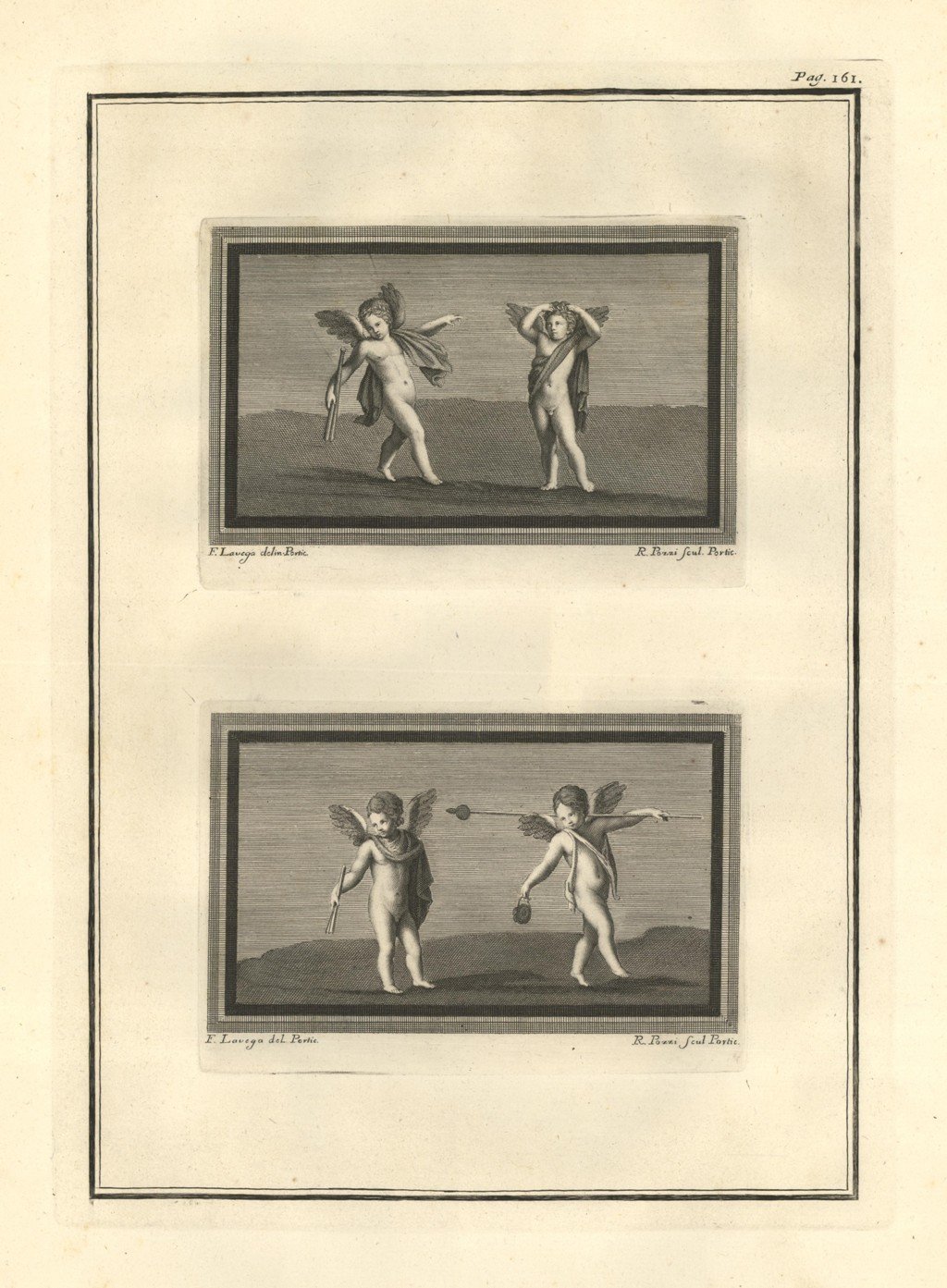 Incisione raffigurante due riquadri in unico foglio con putti. Tratta dal tomo primo della monumentale opera "Le Pitture antiche d'Ercolano e contorni incise con qualche spiegazione", sontuosamente illustrata da diversi artisti tra i quali: Giuseppe Aloja, Nicola Billi, Pietro Campana, Nicola Cesarano, P. Gaultier, Francesco Martano, Filippo Morghen, Camillo Paderni, Rocco Pozzi, N. Ricci, Nicola Vanni, Francisco de Vega. Edita a Napoli dalla Regia Stamperia nel 1757