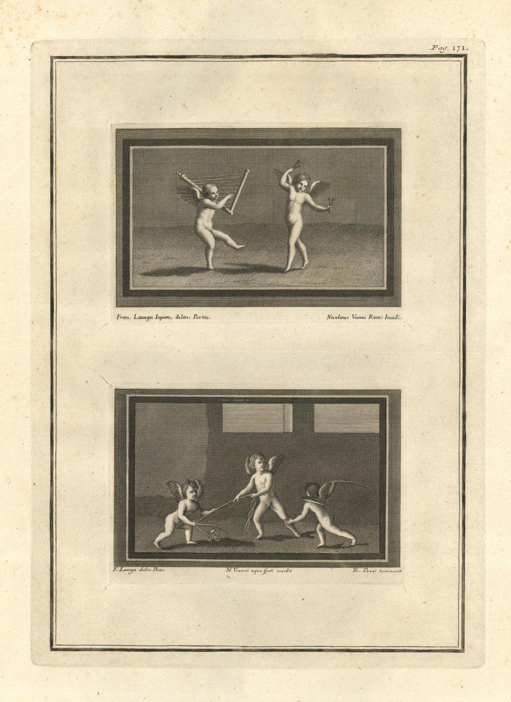 Incisione raffigurante due riquadri in unico foglio con putti. Tratta dal tomo primo della monumentale opera "Le Pitture antiche d'Ercolano e contorni incise con qualche spiegazione", sontuosamente illustrata da diversi artisti tra i quali: Giuseppe Aloja, Nicola Billi, Pietro Campana, Nicola Cesarano, P. Gaultier, Francesco Martano, Filippo Morghen, Camillo Paderni, Rocco Pozzi, N. Ricci, Nicola Vanni, Francisco de Vega. Edita a Napoli dalla Regia Stamperia nel 1757