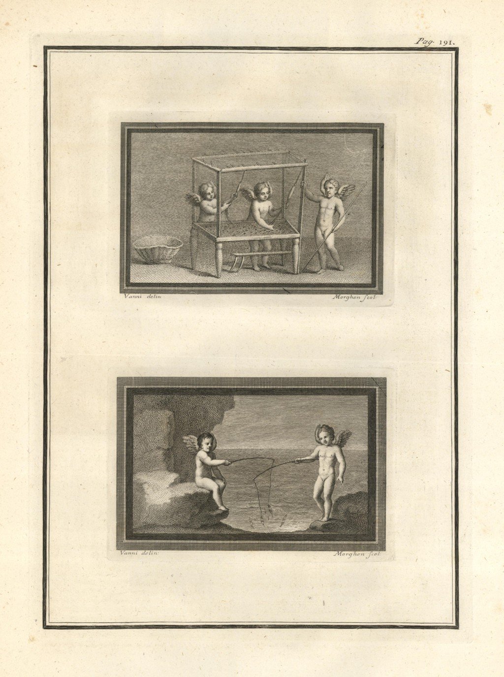 Incisione raffigurante due riquadri in unico foglio con putti. Tratta dal tomo primo della monumentale opera "Le Pitture antiche d'Ercolano e contorni incise con qualche spiegazione", sontuosamente illustrata da diversi artisti tra i quali: Giuseppe Aloja, Nicola Billi, Pietro Campana, Nicola Cesarano, P. Gaultier, Francesco Martano, Filippo Morghen, Camillo Paderni, Rocco Pozzi, N. Ricci, Nicola Vanni, Francisco de Vega. Edita a Napoli dalla Regia Stamperia nel 1757