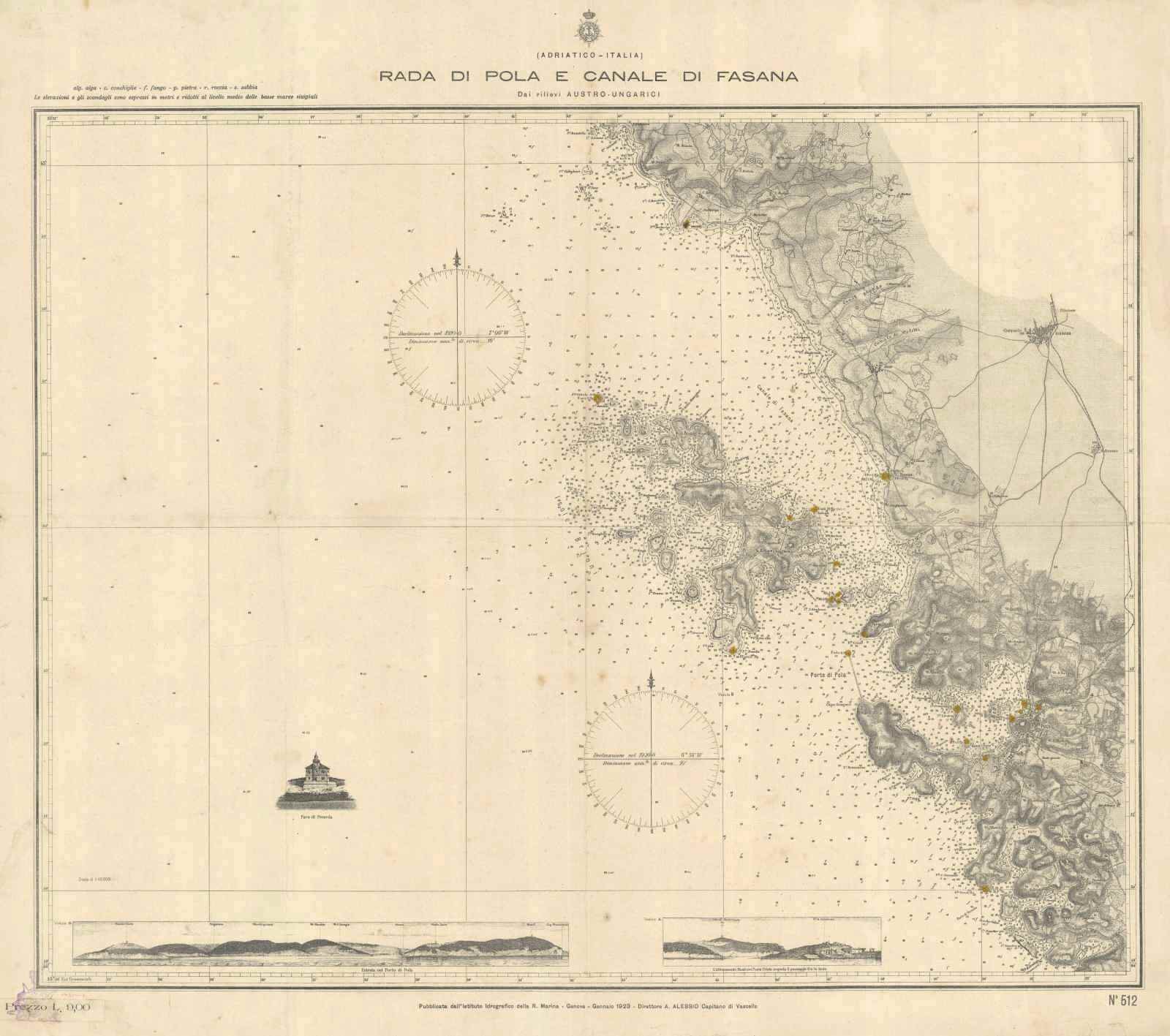 Carta nautica raffigurante la rada di Pola ed il canale di Fasana ottenuta dai rilievi Austro - Ungarici e pubblicata dall'Istituto Idrografico della Reale Marina a Genova nel Gennaio 1923 sotto la direzione del direttore il Capitano di Vascello A. Alessio. La carta è arricchita da due vedute di costa raffiguranti rispettivamente l'entrata nel Porto di Pola e l'allineamento di Musil con Punta Cristo ad indicare il passaggio fra le Isole.