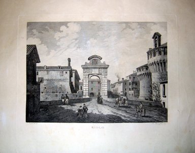 Bella veduta animata in primo piano, con la porta in evidenza e bastioni a destra. Incisione in rame; f. della lastra 43x33 In: Rosaspina, Bernardo - Ventisette incisioni rappresentanti diversi luoghi della Romagna disegnate da L. Ricciardelli ed incise da Bernardo Rosaspina.