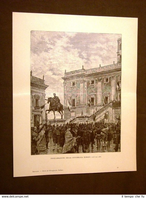 Rara stampa Estratta da pubblicazione dei primi del 1900 Su carta spessa e non retroscritta Risorgimento d'Italia La proclamazione della Repubblica Romana Incisione di Edoardo Matania SDI-028 Dimensioni Cm 26,00 x 32,00 Qualora vogliate delle scansioni migliori contattateci, soddisferemo ogni vostra richiesta. PaypalCarta di creditoBonifico bancario Accuratamente adagiate su un cartoncino e protette da pellicola trasparente rigida,il tutto viene inserito dentro plico di adeguate dimensioni per proteggerne l'integrità.