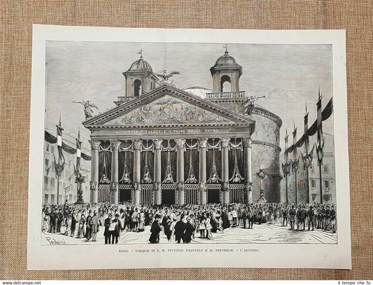Rara stampa estratta da pubblicazione del 1878 Roma nel 1878 Pantheon Esequie per la morte di Re Vittorio Emanuele II di Savoia L'esterno Dimensioni: Cm 34,00 x 26,00 Codice prodotto: II1885-107 Qualora vogliate delle scansioni migliori contattateci, soddisferemo ogni vostra richiesta. Paypal Carta di credito Bonifico bancario Accuratamente adagiate su un cartoncino e protette da pellicola trasparente rigida, il tutto viene inserito dentro plico di adeguate dimensioni per proteggerne l'integrità.