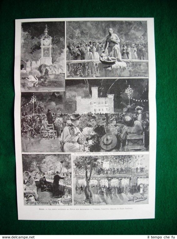 Rara Incisione Estratta da Rivista d'Epoca del 1893 Roma nel 1893 La festa notturna al Pincio del monumento a Vittoria Colonna (disegno di Dante Paolocci) Dimensioni 23x34cm II1893-032 Qualora vogliate delle scansioni migliori contattateci, soddisferemo ogni vostra richiesta. Paypal Carta di credito Bonifico bancario Accuratamente adagiate su un cartoncino e protette da pellicola trasparente rigida il tutto viene inserito dentro plico di adeguate dimensioni per proteggerne l'integrità