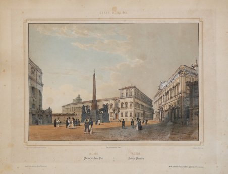 Veduta del Palazzo Pontificio sul Quirinale a Roma, ' tratta da L'Italie monumentale & artistique. Vues et monuments dessine?s d'apre?s nature par Ph. Benoist et lithographie?s aux deux crayons par Bachelier, Ph. Benoist & Jacottet, pubblicato a Parigi intorno al 1860.Litografia tinta, finemente colorata a mano in epoca, in buono stato di conservazione. Philippe Benoist (Ginevra, 1813-1905) fu allievo del grande maestro Louis Jacques Mandé Daguerre (Cormeilles-en-Paris, 1787- Bry-sur-Marne, 1851) pittore di figure, di architetture, di interni, di paesaggi, decoratore di teatro, acquerellista, disegnatore e soprattutto inventore della dagherrotipia che da lui prende il nome, fu insignito della Légion d’ honneur. Philippe apprese dal suo maestro l’arte di eseguire paesaggi ad olio e ad acquerello, ma la sua fama è legata soprattutto alla litografia. Come artista litografico originale, Philippe Benoist si specializzò in vedute esterne e interne di molti edifici famosi. Di solito venivano pubblicate in serie, e tra le più celebri ricordiamo il Monuments du Moyen Age, L'Italie Monumentale et Artistique e le Vues de Paris. Nel 1855 fu protagonista dell’illustrazione di un album sulle sculture del coro di Notre- Dame de Paris. Dipinse e incise su pietra interni ed esterni di chiese: Saint- Paul a Lione, le cattedrali di Toledo, di Reims, e di Sant’Eustachio a Parigi. I suoi dipinti furono esposti quasi tutti gli anni al Salon di Parigi tra il 1836 e il 1879. Le sue opere sono di solito firmate P. Benoist, Ph Beonist semplicemente Benoist. View taken from L'Italie monumentale & artistique. Vues et monuments dessine?s d'apre?s nature par Ph. Benoist et lithographie?s aux deux crayons par Bachelier, Ph. Benoist & Jacottet, published in Paris 1860 circa. Philippe Benoist (Ginevra, 1813-1905) was one of France's most gifted topographical artists of the 19th century, both a master lithographer and painter. He began his career in Paris studying and apprenticing under the most influential pioneer of early photography, Louis Daguerre. By 1836, however, Philippe Benoist had turned entirely to art and was exhibiting his views at the Paris Salons and continued to do so until1879. As an original lithographic artist, Philippe Benoist specialized in exterior and interior views of many famous buildings. These were usually published in sets, such as Monuments du Moyen Age, L'Italie Monumentale et Artistique and Vues de Paris, published in 1881. ' It represents one of the artist's finest undertakings as each lithograph was printed in subtle colors using a number of tint stones. Finally, the figures and some of the foreground objects were then hand-colored by commissioned artists. The end result produced by these large and elaborate lithographs, thus more than justifies Philippe Benoist's position as one of the greatest artists of interior views and monumental scenes of his time. Cfr.