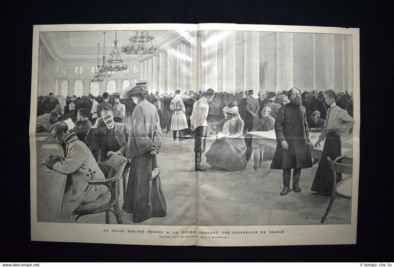 Rara stampa estratta da pubblicazione del 1906. .stampa che ha quindi oltre 112 anni! STAMPA ENORME! La Sala dei Passi Perduti nella Duma, durante una sospensione di seduta + I danzatori cambogiani alla festa in giardino all'Eliseo, 1 luglio 1906 Fronte-retro Dimensioni Cm 52,00 x 34,00 + 34,00 x 26,00 Illustration 1906 - 13 Qualora vogliate delle scansioni migliori contattateci, soddisferemo ogni vostra richiesta. Paypal Carta di credito Bonifico bancario Accuratamente adagiate su un cartoncino e protette da pellicola trasparente rigida, il tutto viene inserito dentro plico di adeguate dimensioni per proteggerne l'integrità.
