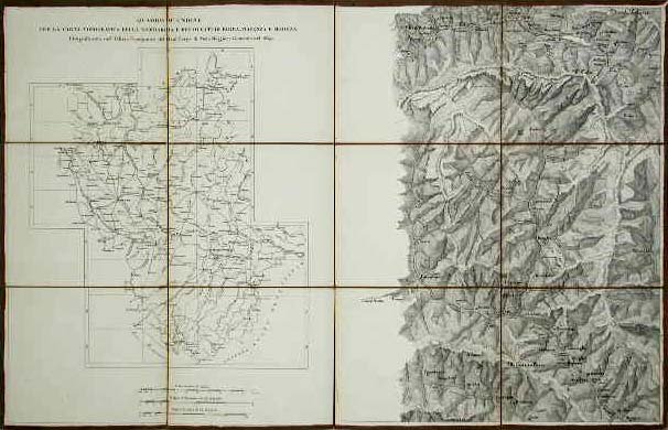 Carta geografica, antica ed originale, raffigurante il territorio del San Gottardo sulla dx. la pianta schematica dell'assieme sulla sx. Foglio A2 facente parte della grande carta murale in 32 fogli (mm 3780x330). Telata e piegata editorialmente. Autore: Doyen. Luogo: San Gottardo - Svizzera. Anno: 1849. Tecnica: litografia. Dimensioni: 420x660 mm