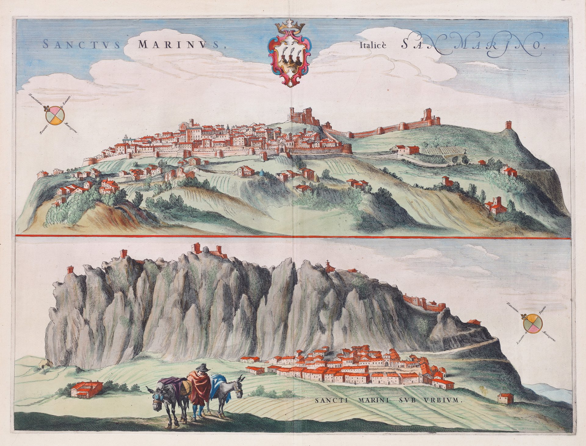 Incisione in rame, finemente colorata a mano d’epoca, mm 460x620. Bella veduta della Repubblica del Titano, ritratta da due contrapposti punti di visione. Tratta da “Theatrum Civitatum…Italiae” di Blaeu del 1663. Al verso del foglio, testo latino relativo alla carta. W. Blaeu, astronomo allievo di Tycho Brahe, fondò un’officina per la costruzione di globi nel 1599; quasi immediatamente iniziò a pubblicare anche carte geografiche, giungendo nel 1630 alla creazione del primo atlante “Atlantis Appendix” e cinque anni dopo, della prima edizione in due tomi del “Atlas Novus”. Dopo la sua morte nel 1638, a cura del figlio Johan si giunse nel 1662 alla pubblicazione del celebre “Atlas Maior” in 11 volumi. Nel 1672 un incendio distrusse l’officina e segnò la fine dell’attività. Splendido esemplare perfettamente conservato.