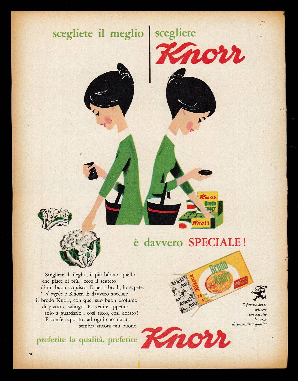 Autore: n.d. Luogo: n.d. Anno: [1960]. Tecnica: offset. Dimensioni: 32x25. Conservazione: buone. Foglio sciolto tratto da periodico anni '60, pagina pubblicitaria Knorr
