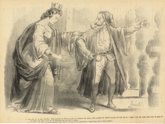 - Cara ela, la xe mal servida: Nella question de Roma la g'ha dei cantanti che stona: nella question de Napoli la g'ha dei buffi che fa i tragici e mi che credo esser attor de polso in sto teatro non ghe xe un can de sugeridor che me tira in scena.- Hai ragione caro mio:.ma abbi pazienza come l'ho io: la tua voce è conosciuta e verrà tempo che si farà sentire!.La stampa è stata piegata per la spedizione e porta al retro, con inchiostro rosso, un timbro rotondo di 1 centesimo,testo al verso