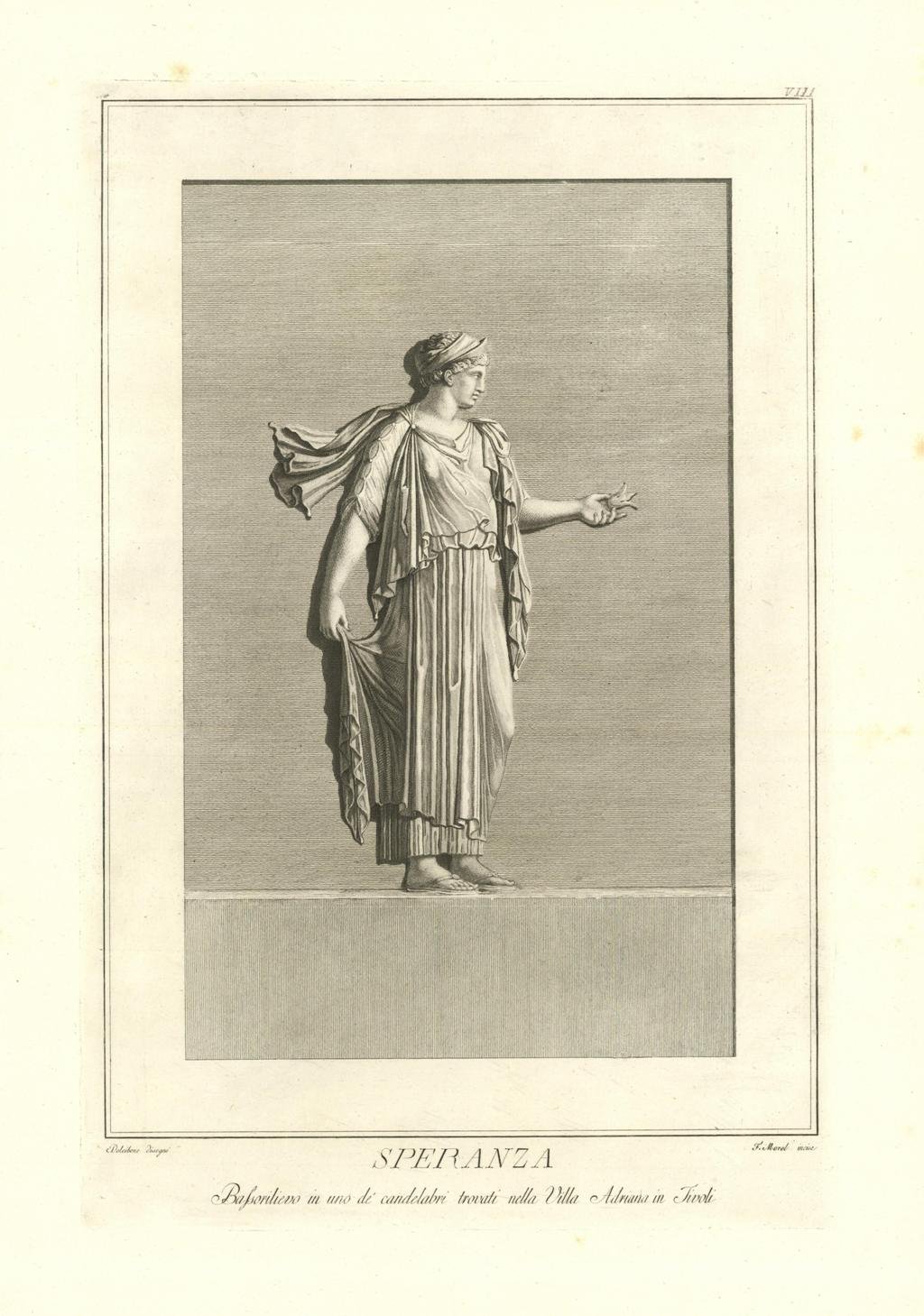 Rappresentazione, con sfondo inciso, di Speranza, dea della mitologia romana. È tradizionalmente definita come ultima dea (in lingua latina: Spes Ultima Dea) in quanto la speranza è l'ultima risorsa disponibile all'uomo. Ripresa di fianco, indossa un bellissimo abito, un peplo che solleva con la destra e un manto svolazzante. Tiene in mano un fiore e calza dei bei sandali. Inserita nell'opera "Il Museo Pio-Clementino descritto da Ennio Quirino Visconti Presidente del Museo Capitolino - Tomo quarto - Dedicato alla Santità di Nostro Signore PIO SESTO Pontefice Massimo. Edito da Luigi e Giuseppe Mirri / Mercante di quadri incontro il Palazzo Bernini. In Roma MDCCLXXXIV con Privilegio Pontificio