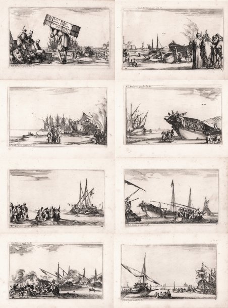 Serie completa di otto tavole marine, compreso il frontespizio con dedica a Lorenzo de' Medici, pubblicate da François Langlois, detto Ciartres, nel 1639. Firmate “F.L.D.Ciartres excudit Cum Pr.” e numerate all'interno dell'immagine da 1 a 8. Raffigurano scene di vita portuale, ispirata al porto di Livorno. Acqueforti, 1639, realizzate da François Collignon - sebbene la serie sia firmata da Stefano della Bella dalla quale deriva - e pubblicate da François Langlois, detto “Ciartres”. La serie comprende otto vedute di porti marittimi e fu dedicata da Stefano Della Bella - nel 1634 - al principe Lorenzo de' Medici, quale omaggio dell'incisore al suo mecenate al ritorno dal viaggio a Roma. Solo del frontespizio si conservano più stati: il primo ante litteram, il secondo con l'indirizzo di Callisto Ferranti, il terzo con l'indirizzo di Arnold van Westerhout. Questa serie di copie è attribuita a François Collignon sulla base di un contratto tra l'editore parigino Ciartres (François Langlois) e Collignon del 1639, in cui l’incisore si impegnava a non fare altre copie della serie di Della Bella per altri editori. Magnifiche prove, impresse su carta vergata coeva, con margini, minime ossidazioni, per il resto in ottimo stato di conservazione. Bibliografia Cfr. De Vesme/Massar 1971 / Stefano della Bella (810); E. Meaume in 'Nouvelles Archives de l'Art Français' 1876, pp.298-300, and 'Print Quarterly' 2002, p. 282. ' Complete series of eight navy plates, including the title page that features a dedication to Lorenzo de' Medici. Published by François Langlois, called Ciartres, in 1639. Lettered in margin with publication detail: "F.L.D.Ciartres excudit Cum Pr." and numbered within image 1 to 8. Depicting scenes of port life, inspired by the port of Leghorn. Etchings, 1639, made by François Collignon (placed as Stefano della Bella), after: Stefano della Bella, and published by François Langlois, il Ciartres. The series includes eight views of seaports and was dedicated by Della Bella (1634) to Prince Lorenzo de' Medici as the engraver's tribute to his patron upon his return from his trip to Rome. Only of the frontispiece multiple states are preserved: the first ante litteram, the second with Callisto Ferranti's address, the third with Arnold van Westerhout's address. This set of copies is attributed to François Collignon on the basis of a contract between the Parisian publisher Chartres (François Langlois) and Collignon dated 1639, in which Collignon undertook not to make any further copies of the Della Bella series for any other publisher. Magnificent proofs, printed on contemporary laid paper, with margins, minimal oxidation, otherwise in excellent condition. Bibliografia Cfr. De Vesme/Massar 1971 / Stefano della Bella (810); E. Meaume in 'Nouvelles Archives de l'Art Français' 1876, pp.298-300, and 'Print Quarterly' 2002, p. 282. Cfr.