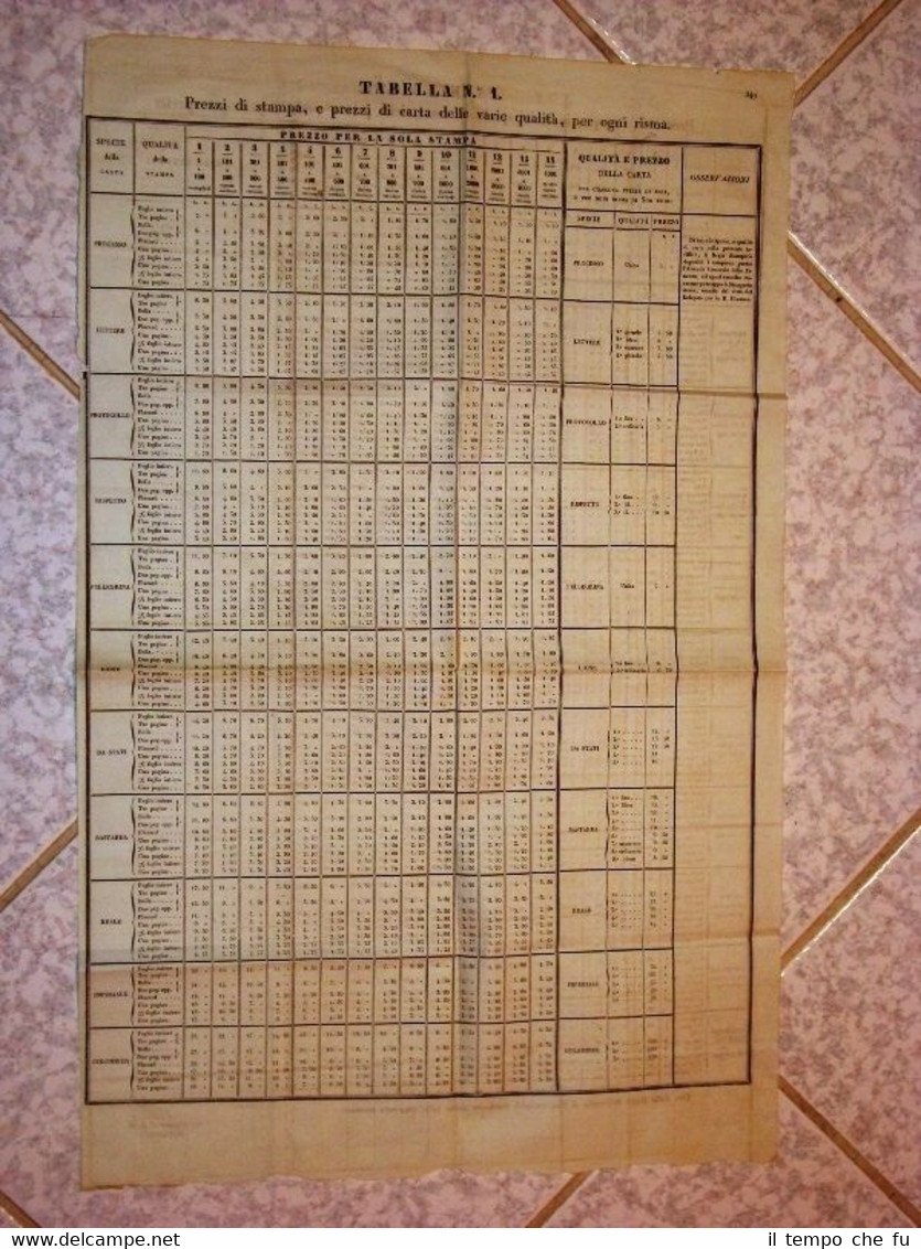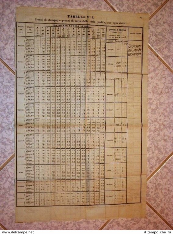 Tabella dei prezzi per la stampa Regia segreteria Finanze Anno 1836 Fima Gallina