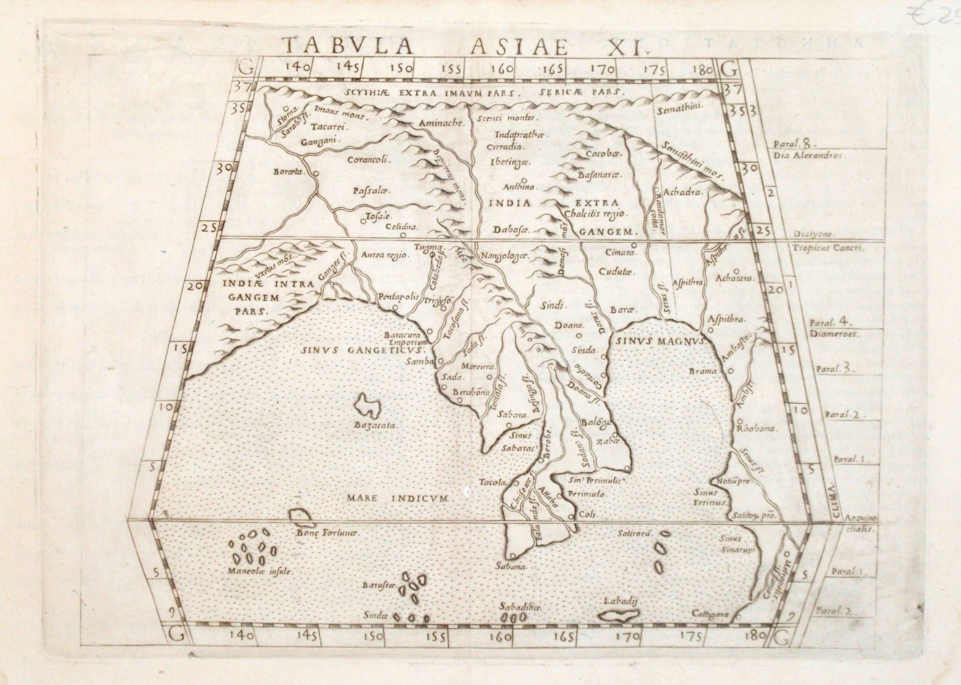 Incisione in rame, mm 190x260. Carta dell'India tratta dall'edizione veneziana della "Geographia" curata da Ruscelli. Buon esemplare con minimo ingiallimento lungo la piega centrale.