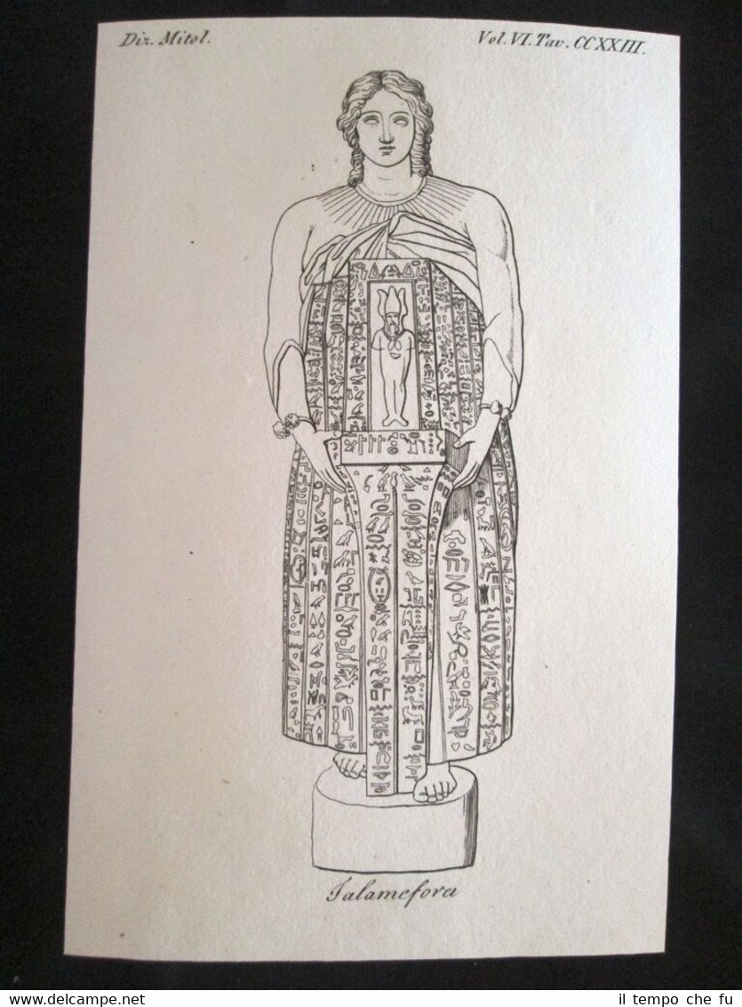 Incisione stampata su carta pesante non retroscritta Estratta da ricercata pubblicazione del 1819 - 1827 . .rara incisione all'acquaforte su rame che ha quindi circa 200 anni! Talamofore, ministra o sacerdotessa egizia Dimensioni Cm 12,00 x 19,00 DoM - 025 Estratta dalla rarissima opera "Dizionario d'ogni mitologia e antichità Incominciato da Girolamo Pozzoli sulle tracce del Dizionario della favola di Fr. Noel continuato e ampliato dal Prof. Felice Romani e dal Dr. Antonio Peracchi" Monumentale lavoro di erudizione e studio dei miti che riprende il Dictionnaire de la Fable (Paris 1801) volgarizzandolo e ampliandolo nella trattazione della mitologia greca, latina, egizia, celtica, persiana, siriaca, indiana, cinese, maomettana, rabbinica, slava, scandinava, africana, americana, araba, iconologica, cabalistica, ecc. Autore: Pozzoli Girolamo Pubblicato da Batelli e Fanfani in Milano tra il 1819 - 1827 Prima edizione italiana Qualora vogliate delle scansioni migliori contattateci, soddisferemo ogni vostra richiesta. Paypal Carta di credito Bonifico bancario Accuratamente adagiate su un cartoncino e protette da pellicola trasparente rigida, il tutto viene inserito dentro plico di adeguate dimensioni per proteggerne l'integrità.