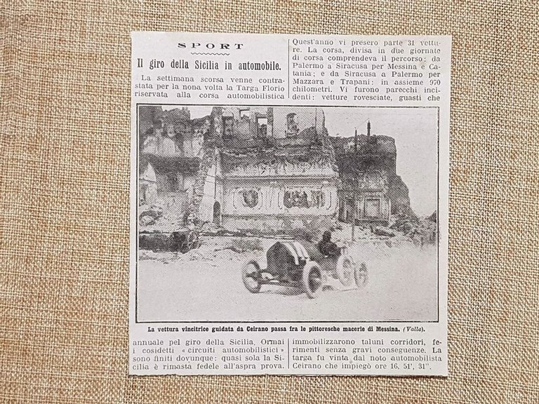 Targa Florio o Giro della Sicilia nel 1914 Tra macerie di Messina Vince Ceirano Rara stampa estratta da pubblicazione del 1914 La Targa Florio o Giro della Sicilia nel 1914 Passaggio tra macerie di Messina Vince Ceirano Codice prodotto: VIP-188 Dimensioni Cm 12,00 x 13,00