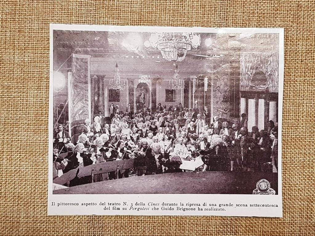 Rara stampa estratta da pubblicazione del 1932 Stampa che documenta l’interno del teatro di posa romano della Cines nel momento in cui si sta girando una complessa scena ambientata nel Settecento per il film biografico dedicato a Giovanni Battista Pergolesi, diretto da Guido Brignone. L’ampio set ricostruisce con dovizia di particolari un ambiente d’epoca, con scenografie dipinte, arredi storici e comparse in costume, restituendo l’atmosfera fastosa e teatrale tipica della produzione. L’immagine offre uno spaccato prezioso della macchina produttiva del cinema italiano dei primi anni Trenta e della cura scenografica che caratterizzava le grandi produzioni della Cines. Dimensioni Cm 12,00 x 10,00 Codice prodotto: S.I. - 070 PayPal Carta di credito Bonifico bancario Inserita dentro plico di adeguate dimensioni per proteggerne l'integrità Spedizione con posta ordinaria o raccomandata scelta dall’Acquirente nel momento del pagamento Clicca qui per accedere al nostro Store ed al suo sterminato archivio