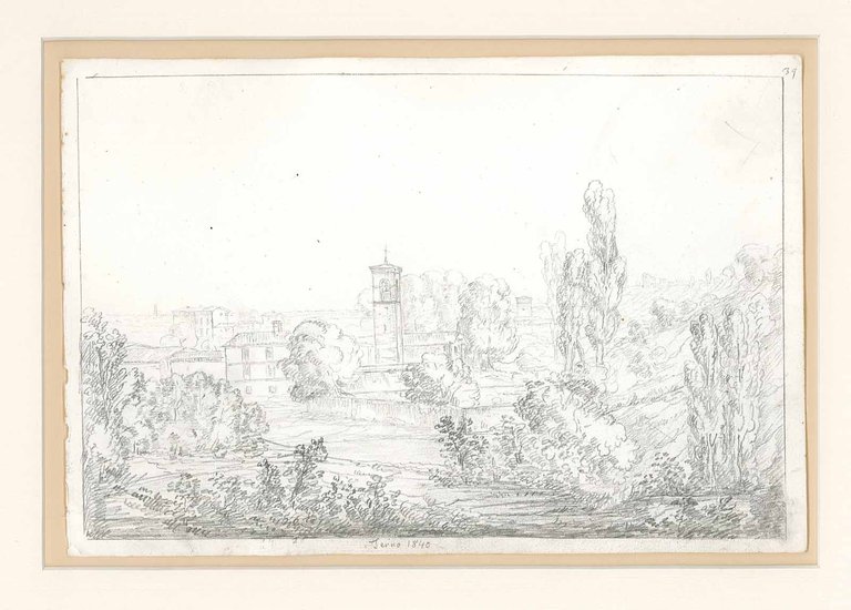 Disegno n° 39 raffigurante uno scorcio della cittadina di Terno, attribuito al famoso pittore bergamasco Pietro Ronzoni (Serina 1781 - Bergamo 1862). Opera pubblicata in "La Bergamasca / e dintorni / di / Pietro Ronzoni" di Lanfranco Ravelli critico d'arte bergamasco. Pubblicazione di 60 disegni edita sia dalla Banca di Bergamo che dalla Galleria Previtali di Bergamo. Montato in elegante cornice di ciliegio chiaro della misura di cm. 34x44. Al disegno è allegato uno dei volumi prima citati su cui è stato pubblicato