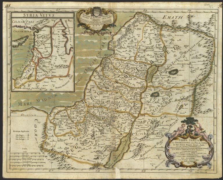 Terra Sancta: siue Promissionis, olim Palestina, in duo diuisa Regna, Israel et Iuda et in sex sub diuisa Provincias scilicet Iudaea, Samaria, Galilaea, Trachonitide, Peraea et Idumaea ac in duodecim Tribus Filiorum Israel