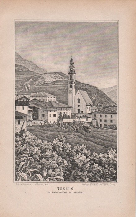 Litografia di dimensioni 162x102 mm. Condizioni : USATO - Stato : Buono, ordinari segni d'uso e del tempo. Altre note : Rara veduta di Tesero in Val di Fiemme: la ricca vegetazione in primo piano lascia spazio alla chiesa di S. Eliseo. Si trova in una pubblicazione tedesca, "Alpenfreund" (vol. 9). Disponibile anche acquarellata.