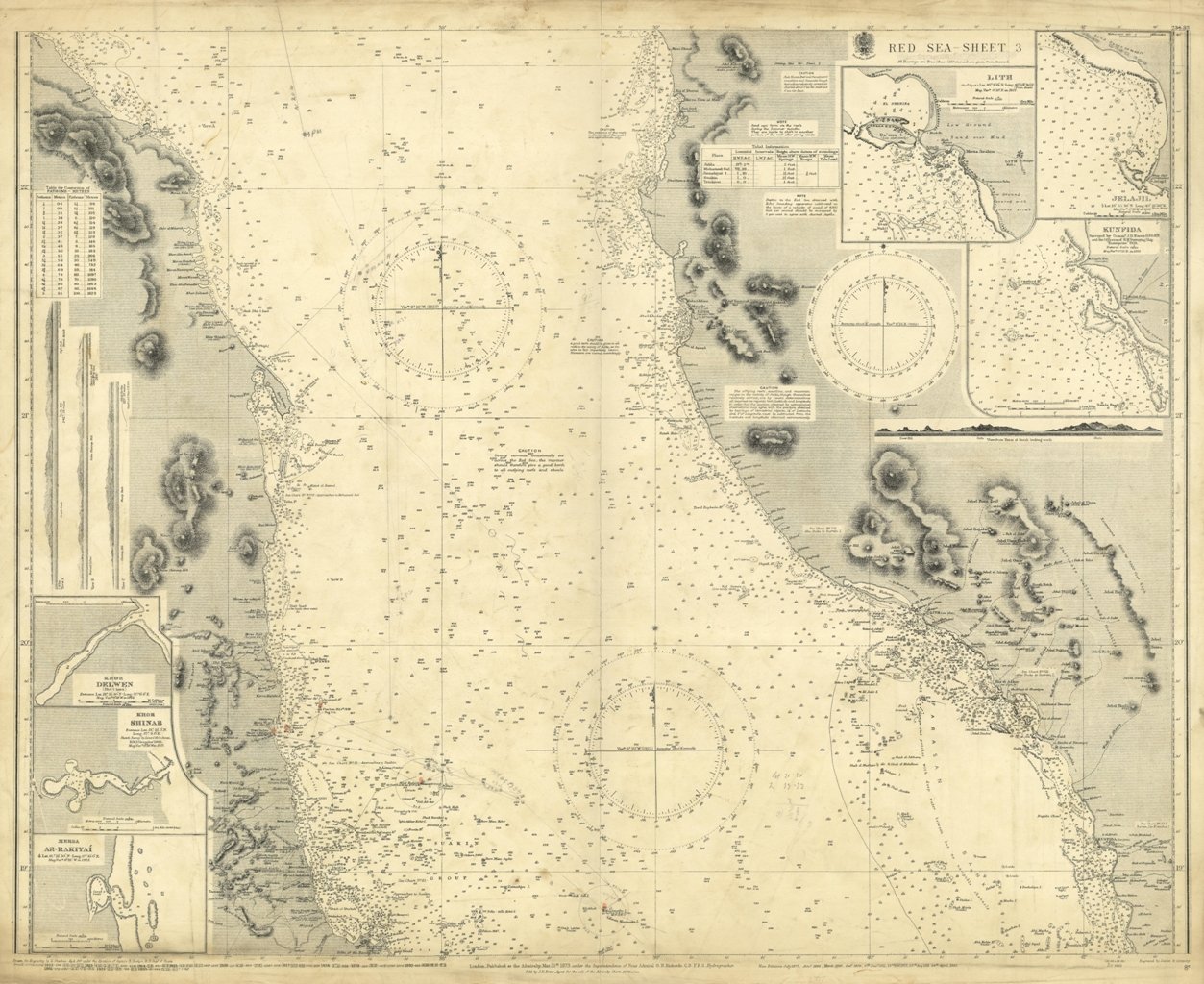 Red Sea - Sheet 3 All Bearings are True and are given from Seaward. In the upper right corner insert of Lith, Jelajil and Kunfida Surveyed by Comm. J.D. Nares and the Officers of H.M. Surveying Ship "Entreprise " 1918. In the lower left corner insert of Khor Delwen, Khor Shinab and Mersa-Ar-Rakiyai. London Published at the Admiralty Mar. 31st 1873, under the Superintendence of Rear Admiral G.H. Richards, Hydrographer. Small corrections: 1933. Editorially folded. Autore: Admiralty Charts. Luogo: Red Sea - Mar Rosso. Anno: '900. Dimensioni: 663x838 mm