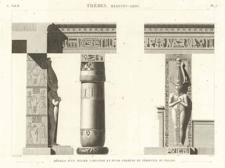 Thèbes. Medynet-Abou - Détails d'un pilier caryatide et d'une colonne di péristyle du palais