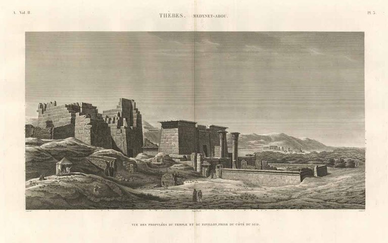 Thèbes. Medynet-Abou - Vue des propylées du temple et du pavillon, prise du cote du sud.