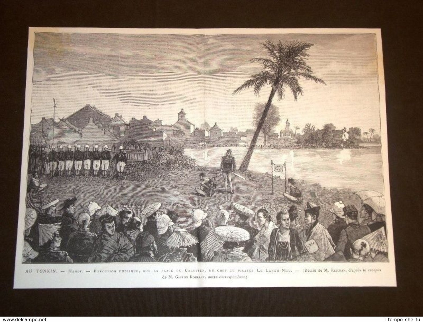 Splendida e rara Incisione Estratta da Rivista d'Epoca di fine '800 Tonkin o Tonkino Hanoi Esecuzione pubblica del Capo dei pirati Langh - Nhu Piazza del Cocotier MI1886-014T Dimensioni Cm 31,00 x 22,50 Qualora vogliate delle scansioni migliori contattateci, soddisferemo ogni vostra richiesta. Paypal Carta di credito Bonifico bancario Accuratamente adagiate su un cartoncino e protette da pellicola trasparente rigida il tutto viene inserito dentro plico di adeguate dimensioni per proteggerne l'integrità
